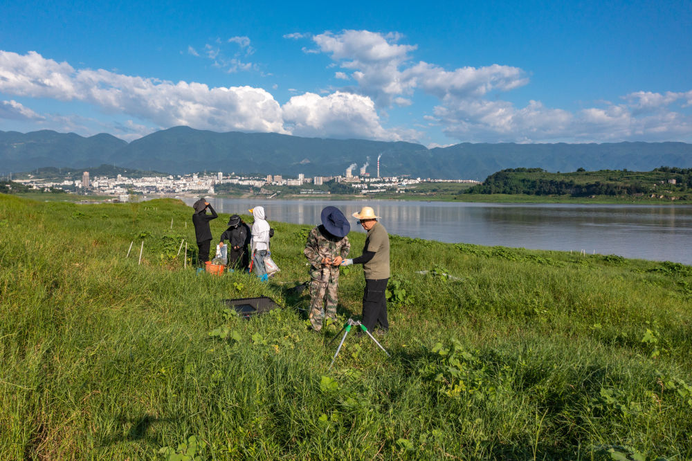 在位于重慶的中國(guó)科學(xué)院三峽庫(kù)區(qū)水土保持與環(huán)境研究站,中國(guó)科學(xué)院成都山地所科研人員在庫(kù)區(qū)消落帶上開(kāi)展相關(guān)監(jiān)測(cè)(2023年7月5日攝,無(wú)人機(jī)照片)。新華社記者 黃偉 攝